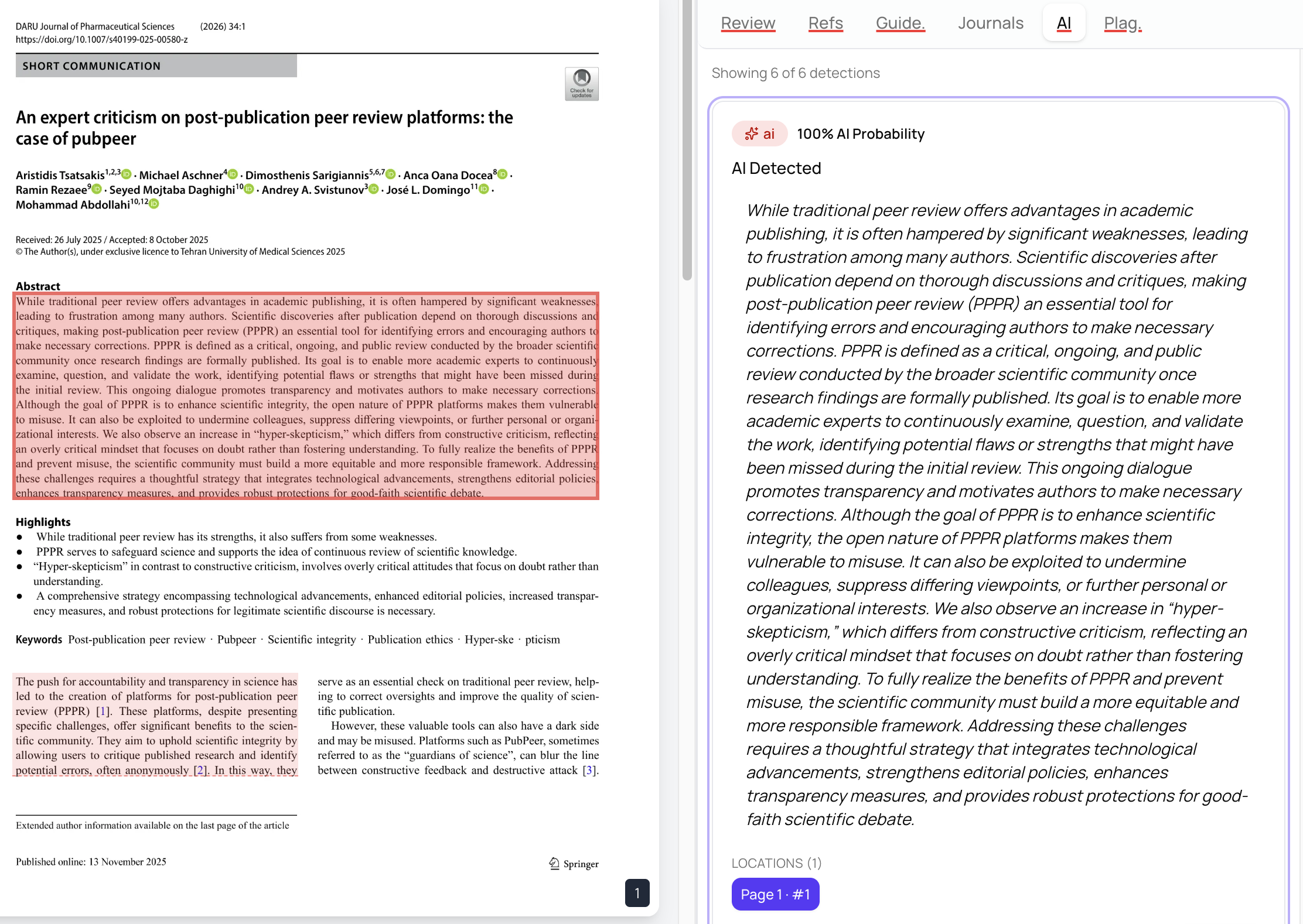 A manuscript with one AI-generated methods section and an otherwise human-written discussion will show exactly where the concern lies,An editor can open the AI tab, see the exact passage that triggered the alert, check the model's confidence, and decide whether it reflects acceptable editing assistance or undisclosed machine-generated writing.