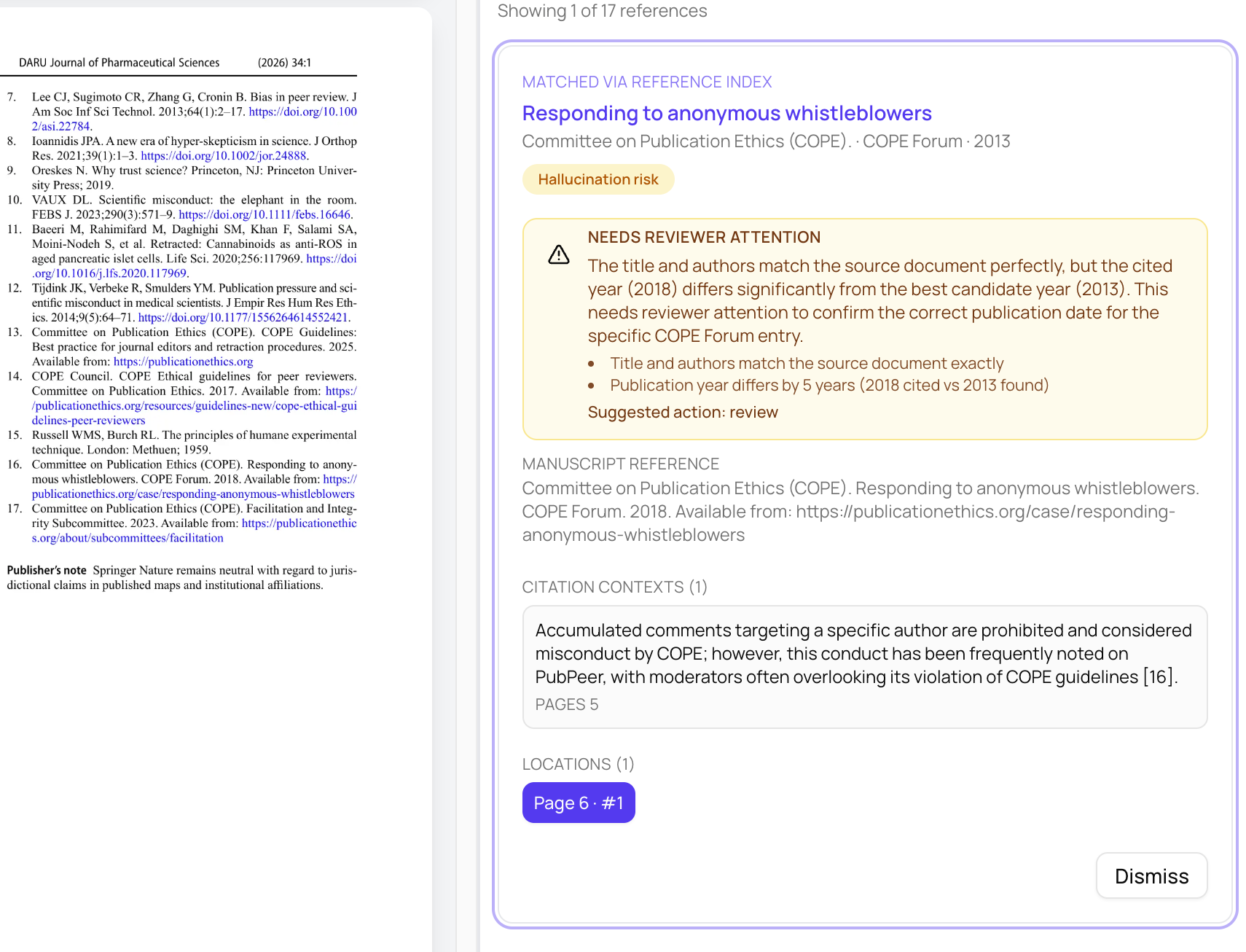 We check references against known source records and highlight mismatches that deserve editorial review. We have hundreds of rules to help determine if a reference has a typo or maybe it has a hallucination risk. We also analyze where the reference in used in the manuscript (e.g., the citation context) and determine if it is a good fit or potentially a citation inflation attempt.