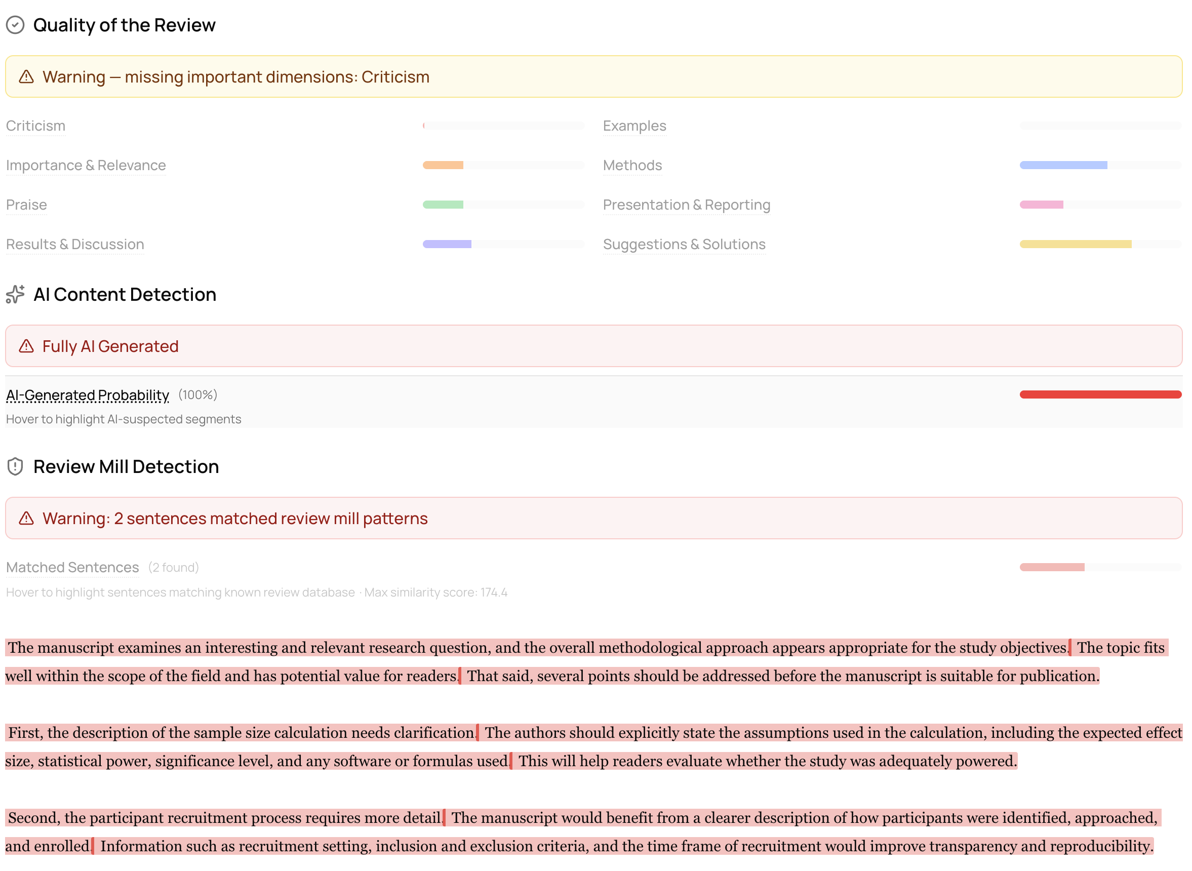 We also run review mill detection that compares review sentences against databases of confirmed review mill content, flagging coordinated boilerplate language, suspicious citation manipulation, and formulaic praise. Each match returns a similarity score and source dataset, giving editors concrete evidence rather than vague suspicion.